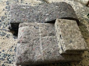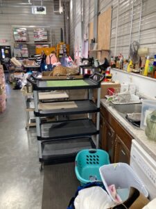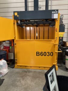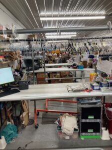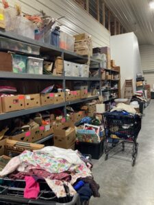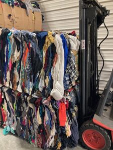 Clothing, bed-sheets, ball-caps, stuffed animals, leather coats and purses, and shoes that are unfit for resale are stored for recycling. Cloth items are placed into our bailer.